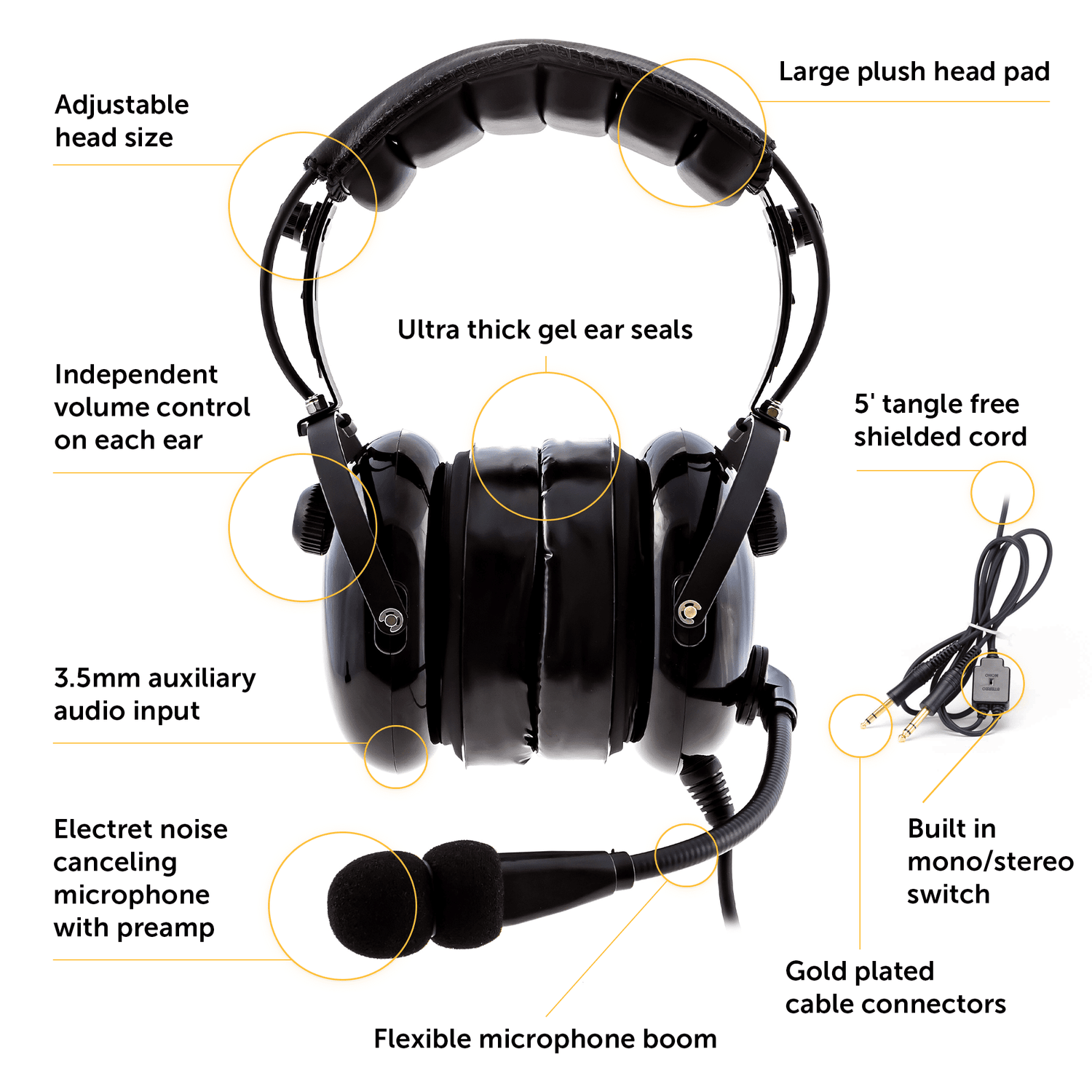 The electret noise-canceling microphone with preamp sits on a flexible 360° boom, keeping your transmissions clear at all times. For all-day comfort, the KA-1 is fitted with silicone gel ear seals, an extra-thick head pad, and an adjustable headband, making it a solid choice even on longer flights.